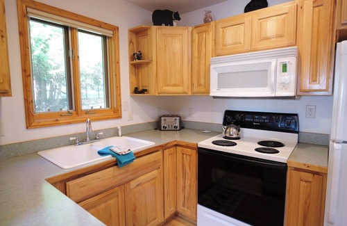 The bunkhouse has two bedrooms, each with a Queen bed, and one Full bath with a stand-up shower. The kitchen is equipped for all your basic cooking needs.