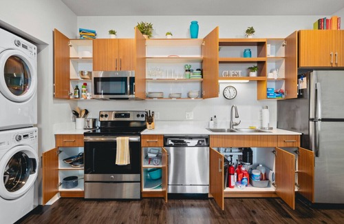 ☆☆ KITCHEN & LIVING ROOM ☆☆ The open concept kitchen and living area make it easy to hang out together while the chef in your group whips up tasty meals. The fully equipped kitchen is stocked with modern stainless steel appliances, a blender, a toaster, and a coffee/tea station to make your mornings as easy and enjoyable as possible. Seating for six is available at the dining room table. If you’re traveling with youngsters, there is a high chair in addition to children`s bowls and utensils.