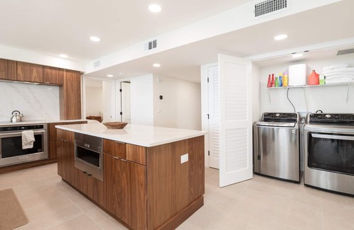 The modern, high-end kitchen is outfitted with brand-new KitchenAid appliances and stocked with everything you need for dining in.