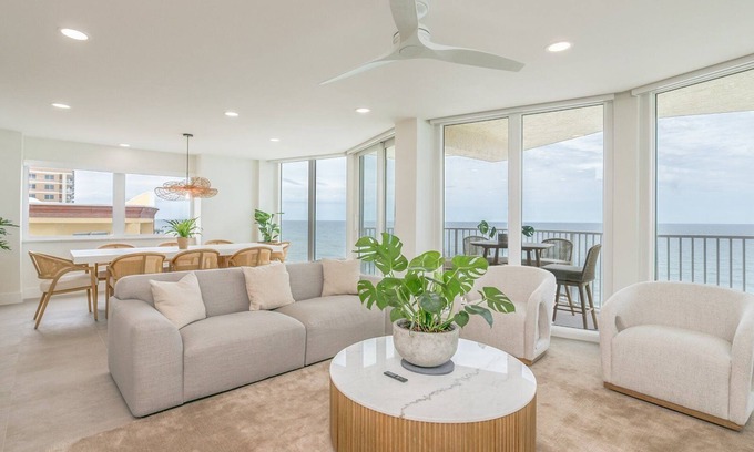 This stunning oceanfront condo redefines relaxation and sophistication. Boasting a completely remodeled interior, this brand-new unit offers breathtaking panoramic views of the Atlantic Ocean from the open-concept kitchen, living, and dining areas.