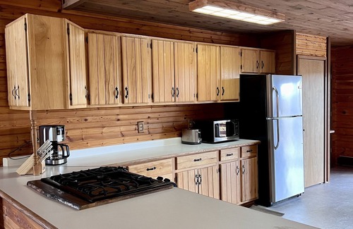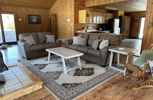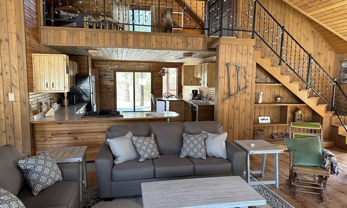 White Pine Hollow is a cabin in the Hiawatha National Forest, just outside of Munising. The Isolated cabin sits on several acres with a path to a creek where everyone can enjoy peace and tranquility. This cabin sleeps 7 with a Queen bed in the loft and a bunkbed (twin & full size beds) in the downstairs bedroom. Open concept living area and kitchen. There is a sleeper sofa in the living room as well. Huge living room windows to watch wildlife that may cross through the property or to watch the snowfall during a cozy afternoon. Enjoy the newly built balcony from the loft area!