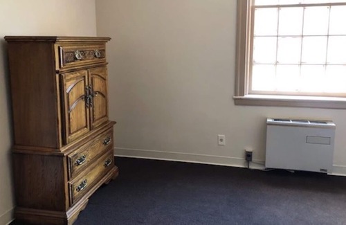 Former office building newly renovated and currently it is being rented as short term stay studio apartments. Room 8 has a queen bed and basic furniture with a separate full shared bathroom across the hall. Though very private and quiet, it's also in a great location close to the interstate and directly next door to the largest Grocery chain in the area and many restaurants. There is a weekly or semi-weekly provided cleaning service for a nominal fee of $35 which would change bedding, clean bathroom and replenish toilet paper. Ideal for short term stay work assignments. This is a very unique building modeled after colonial Williamsburg architecture. The bricks were imported special from Virginia and it has a special history.