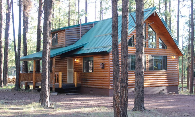 Our Shoshone Cabin is a great cabin for large groups! It has lots of sleeping space. It is a 2 bedrooms (one with a king & the other a queen size bed) It has 2 baths--one with a large double jacuzzi bathtub (with double shower heads) & the other a shower. It sports a huge loft that has 2 queens, 1 full & 3 twins, as well as an air hockey game! The great room also has a queen & full size futon. This cabin has a fully equipped kitchen, gas fireplace, smart TV, WiFi, washer/dryer, air hockey game, gas BBQ, horse shoe pit, campfire pit & volleyball net & ball. We are located just across the road from the 3 Greer Lakes which is stocked with fish by AZ Game & Fish.