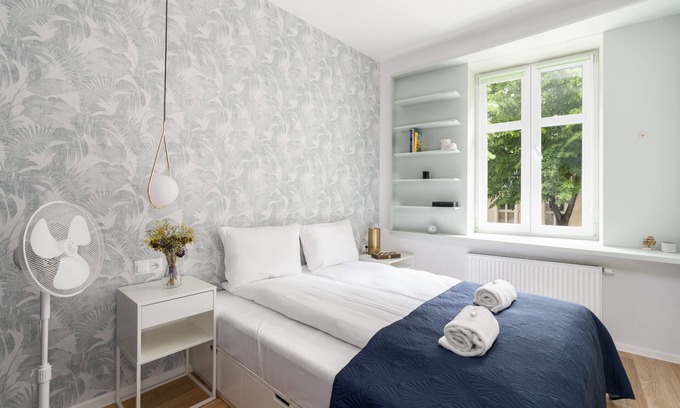 The apartment is located on the high ground floor and can accommodate up to 4 people, which makes it an ideal offer for people traveling as a couple or in a group. Due to the attractive surroundings, we also recommend this offer to families with children. It is worth mentioning the good soundproofing of the apartment, thanks to which there is peace and quiet inside. Due to the characteristic construction, the ceiling of the apartment is 2.75 m high, thanks to which the interior does not heat up in hot weather. Natural light, coming in through the large windows, makes the whole apartment very sunny and bright. In the bedroom, guests will find a double bed, and in the living room - a comfortable fold-out sofa. The kitchen area is equipped with all necessary kitchen appliances that allow you to prepare tasty home-made meals. The apartment is equipped with basic amenities such as iron, ironing board, vacuum cleaner and hair dryer. The apartment is also equipped with a washing machine, which will be appreciated by families with small children or those planning a longer stay.
