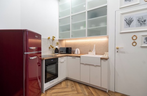 Silesian Homely Studio is a modern, fully equipped studio apartment designed for comfort and convenience. The living area is connected to a functional kitchenette that includes everything needed for everyday use: a fridge with freezer, oven, microwave, electric kettle, coffee maker, and a full set of dishes and cutlery.