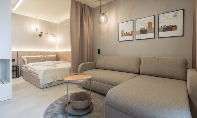 Silesian Superior Studio features a stylishly furnished living room with a fold-out sofa and a comfortable double bed, a kitchenette, and a bathroom. Guests have access to a variety of amenities including free Wi-Fi, a TV, washer-dryer, iron, hairdryer, oven, fridge with freezer, dishwasher, induction hob, microwave, coffee machine, kettle, and kitchen utensils.