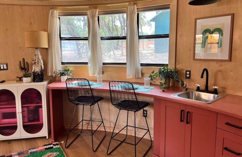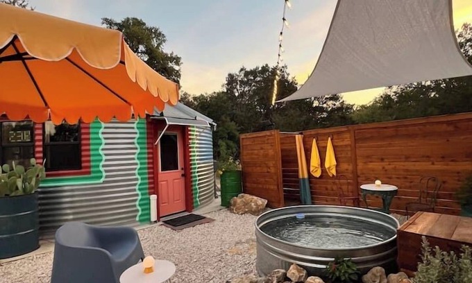 Mentioned as one of the best Airbnb’s in Austin by Architectural Digest. This is our newest unit! We took the shell of an old grain silo and turned into a brand new tiny home. Located on a wooded and secluded 3.5 acres in South Austin. Private outdoor space, fireplace, king bed, fast WIFI, outdoor shower, & private stock tank pool(March-October) Check out our other two units from our airbnb profile page. Outdoor live music & food trucks next door. Only 10 miles from downtown ATX.