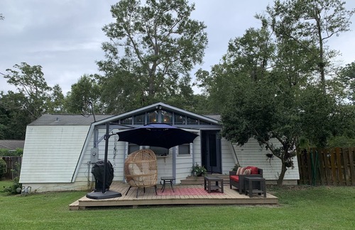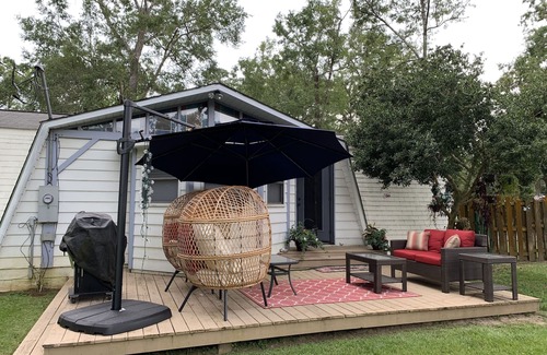 This unique newly renovated home has quirky charm with beamed ceilings and stain glass throughout. A thoughtful blend of modernized features to captivate the vacationing guest! Hardwood floors and a fabulous new kitchen, broad eating bar and inviting open floor plan. Beautiful large backyard with grill and comfy outdoor furniture. The home sits on a half acre lot in a quiet cul-de-sac a short walk from Fairhope downtown. Located in Fairhope‘s Fruit and Nut district , within walking distance of Mobile Bay. Sleeps five .The unique circular Silo room has a twin pull out bed making room for another guest!