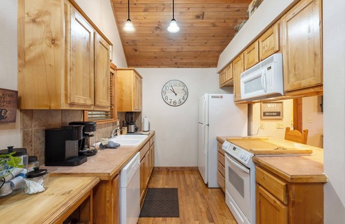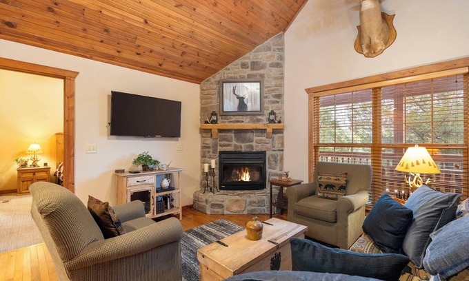 The home’s interior surrounds you in desirable rustic-chic cabin vibes, where rich wood flooring, trim, and accents surround you in natural warmth and comfort. Settle into the living room on plush sofa and armchair seating as you surf the channels on the TV. During the cooler months, set the fireplace ablaze to create the perfect ambiance for a family movie or game night. The well-equipped kitchen has everything you need to whip up convenient homecooked meals along with ample cabinetry for storing all your foodstuffs. Gather together for formal meals at the elegant table with seating for 6, or head out onto the screened-in deck to immerse yourself in back in nature and dine al fresco with a side of serene forest views.