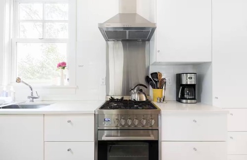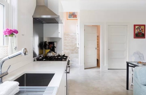 Reminiscent of an old barn on the outside, the farmhouse is luxuriously fresh, contemporary, and romantic. Enjoy morning coffee on the porch surrounded by nature. Wander miles of forested trails or a casual island bike ride or paddle nearby waters. Located in the historic farming community of Eagledale, your lovely 850 sf home is two miles from the ferry and a short walk to forest trails and Puget Sound waters. You will love the fresh, white, modern and light-filled interior. Radiant pipes heat the concrete floors and wood-planked vaulted ceilings top off the bright space you will call home. A special Vermont Castings propane stove keeps the space warm and cozy while thoughtful finishes show incredible attention to details. Privacy abounds in your space and on the surrounding green space. We love to have dog visitors and provide special amenities when you let us know that your 4-legged family is joining you when you book your stay.