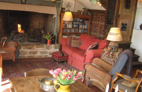 Le Tramizal has two levels. The main floor is open plan with a kitchen, dining and a living area facing a large fireplace with a woodstove. Upstairs is a roomy bedroom with two beds and the bathroom. The cottage is the holiday home of a children’s book author and illustrator, and is filled with artwork, books, music...and teddy bears.