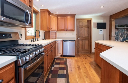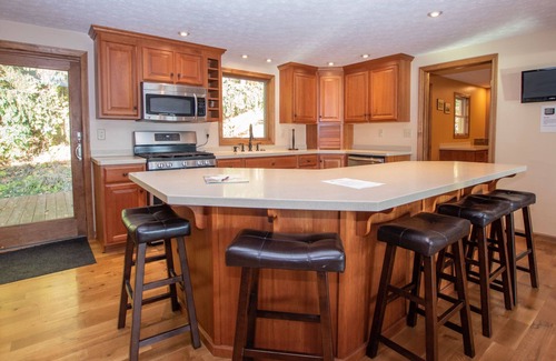 Step inside, and you'll be greeted by a spacious living area featuring gleaming hardwood floors, soaring vaulted ceilings, and oversized glass windows that frame the water. The beautifully appointed kitchen, complete with a breakfast bar and stainless-steel appliances, is perfect for hosting guests and creating memorable meals. A cozy dining area with seating for six sits just off the kitchen, while the island breakfast bar provides additional seating for five. Just beyond the kitchen, a full-sized laundry room with pet bath and access to the back porch lead to a large hot tub—ideal for unwinding after a day on the water.
