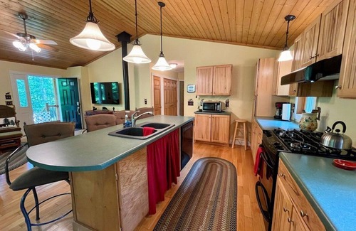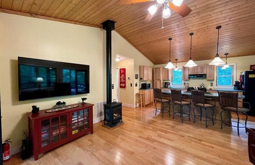Tucked away in a serene wooded setting, this charming 2-bedroom, 2-bath cabin offers the perfect escape for families, couples, or friends seeking peace, privacy, and comfort. Surrounded by nature, the home features a spacious great room with vaulted ceilings, a cozy freestanding gas log stove, and comfortable furnishings—including a sleeper sofa to accommodate extra guests.