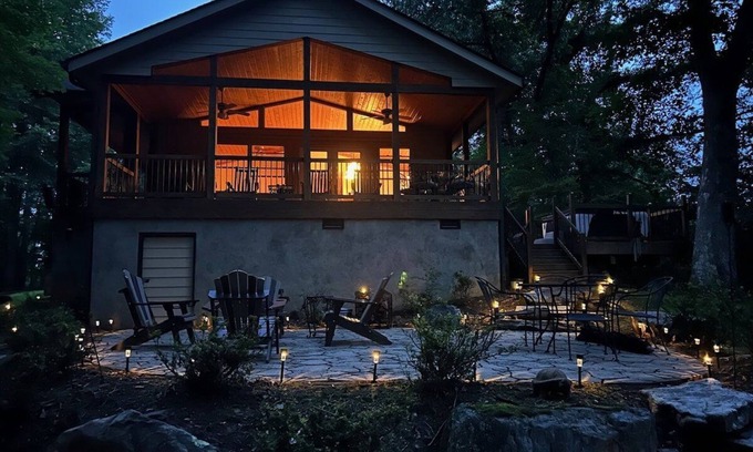 Step outside onto the large covered deck, where you can relax rain or shine. Soak in the private hot tub beneath the trees, sip your morning coffee from a rocking chair, or fire up the charcoal grill for an evening cookout. The adjacent stone patio features a wood-burning fire pit, Adirondack chairs, and patio seating—ideal for roasting marshmallows or stargazing after dark.