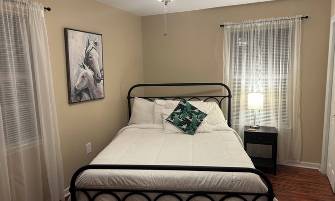 Fully furnished spacious and tranquil three bedroom 2nd-floor 1200 sq ft apt w/peaceful deck surrounded by trees and mountainside. Private entrance and off-street parking for up to 3 spaces. Fully equipped kitchen w/Keurig. 3 BR, 2 BA includes Master bedroom w/ queen 2” memory foam topper for comfort and private full-size bathroom with tub and shower. The second and third bedrooms have full-size beds and share a full-size bathroom w/tub and shower. The unit has a flat-screen Roku TV, high-speed Wi-Fi, and a washer/dryer. Situated on a private country lane with w/wildlife & rescue horses outside as pasture art. Sleeps 6. Southern Adventist University is 2 miles away & Lee University is within driving distance. Nearby hiking, mountain biking trails, shopping, downtown Chattanooga, star gazing, and a wealth of indoor/outdoor activities nearby, including the Tennessee River within 15-30 min. Restaurants and shopping include Cambridge Square and Hamilton Place Mall. Outdoor activities: The Greenway, Little Debbie Park, Summit Softball, VW Enterprise South & Equestrian Trails, and Pickleball are within 4 miles! Nearby, Hulsey Wellness Center offers a pool, rock wall, and gym for a nominal fee. Free Frisbee golf course nearby. Local Industries: VW, Amazon, Mckee, and Gestamp. The property is Family-friendly & Substance-free, with NO Alcohol/Smoking/Vaping/Drugs/or Pets on the property for the safety of all, including humans and rescued animals. No exceptions. Please do not book if you and all guests disagree with the house rules. Great place to vacation, get away, work remotely, or transition to the area!