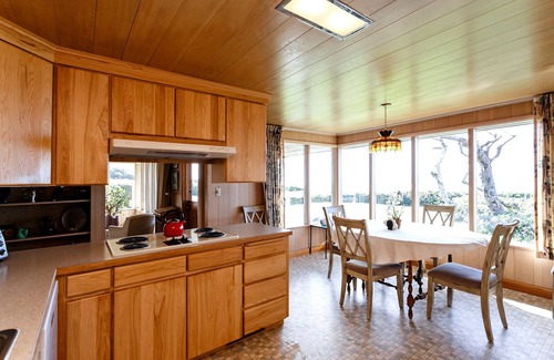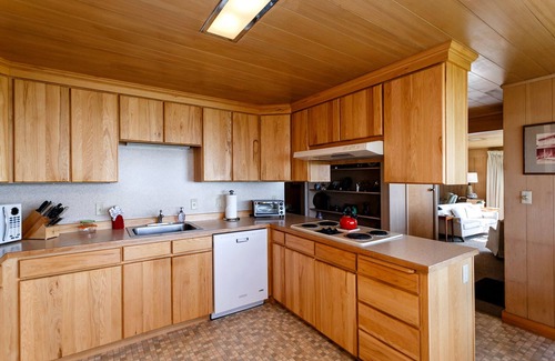 The living room has a wood-burning fireplace (wood is provided), and the fully equipped kitchen was recently remodeled. Both rooms have ocean views. 'Singing Sands' also offers cable TV, free Wi Fi, a Blu-Ray DVD player, a laundry room with a washer and dryer, a one-car garage, a supply of bedding and towels, and a well-landscaped yard.