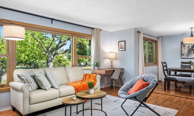 This fantastic single level ranch style home sits tucked away in a quiet suburban neighborhood just southeast of Portland. The home enjoys thoughtfully done décor and furnishing throughout as well as a fully fenced yard making it a wonderful option for small groups or families travelling with pets or kiddos.