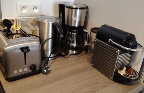 The kitchen is equipped with an oven, a stovetop, and a refrigerator, as well as a coffee maker, an electric kettle, and a microwave. Bathroom amenities include a hair dryer, towels, and toilet paper. And because there's access to laundry facilities, you can go a bit lighter on your packing. Other amenities include bed sheets, an ironing board, a phone, and heating.