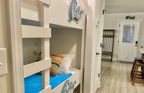 This newly renovated single story ranch features 2 bedrooms and 2 bathrooms with some extra sleeping areas! The kitchen has a gas stove, double oven, stainless steel appliances, and is open to the living and dining areas. Bedroom #1 features a queen bed and attached full bathroom with easy access shower. Bedroom #2 features 2 twin beds. The queen sleeper sofa in the living room and single bunk space provides extra space for sleeping. There is an office work space with desk off the living room. The second bathroom with tub/shower combo and laundry closet with stack washer dryer are just off the main hallway. The cottage is decorated with nautical decor.