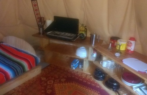 ………Supplies provided include firewood, basic cooking pots, pans, plates cups, glasses and utensils, plus salt, pepper, cooking oil,, bathroom tissue, dish detergent, trash bags, and spare propane tanks for the camp stove. In addition to bedding and towels, we recommend you bring matches, a flashlight, and newspaper [or fire starter fluid] to start the campfire. We son't leave paper towels for guests because mice qickly make a mess with them. There is a 2 burner Coleman propane camp cook stove in case you wish to cook without making a fire. The mattress in the tipi is a double, plus there is a futon couch that folds down to make a twin bed, if you have more than 2 people. [The futon is a twin size, less than a double, but can accommodate 2 people - snugly.] As this is camping, you will need to bring your bedding and towels. There are quilts and pillows supplied, so you needn’t bring those. As we do not live nearby, we cannot do "housekeeping" for the tipi after each guest. We must rely on guests to respect the next camper and leave the tipi, the dishes, bed, etc. clean and tidy, and to take all trash and put in the receptacles. There are trash and recycling cans at the beginning of the road in to the property.