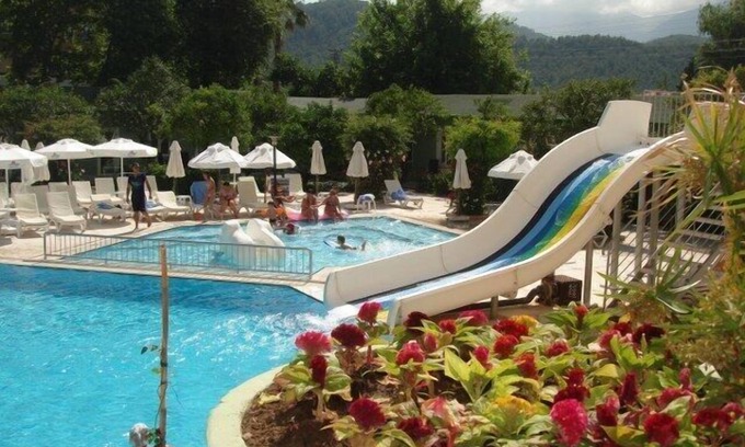 An outdoor pool and a children's pool are on site. Other recreational amenities include a private beach, a waterslide, a sauna, and a fitness center.