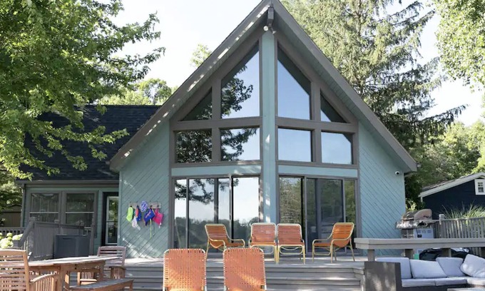 Just two hours from Chicago, this 1970's A-Frame boasts rustic charm with every modernized amenity right on Dewey Lake. Three bed, Two Bath located in the magic of the Sister Lakes. Enjoy 80 feet of lake frontage with panoramic views. Floating dock, Lilypad, and Kayak included in rental.