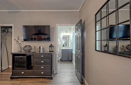 For a family or group of friends looking for a place that keeps everyone together while still maintaining a sense of privacy, you won't find a better home! A combination of six stylish bedrooms with modern ensuite bathrooms ensures everyone's comfort. Once you've come home after a long day of seeing the sites, you can turn on the TV and watch a favorite movie or show. Plus, you have access to a small kitchenette in each room to make some popcorn or make a quick snack! If you still have some energy when you return from a fun day in town, spend the evening out in the large yard and spacious deck with a cocktail in hand as the sun dips below the trees! Central air-conditioning and WiFi round out the interior amenities. Each studio can also be rented out separately for smaller parties.