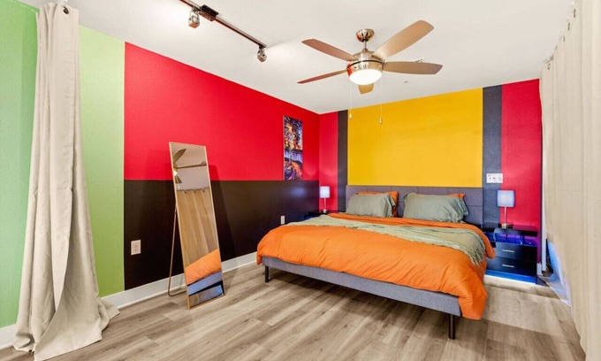 Discover romance and modern elegance in our Enchanting Studio, perfectly situated near The Rim and Six Flags. Ideal for couples or family with small kids, it features a luxurious king bed set against a vibrant decor of red, black, and yellow, framed by a sleek black theme. Enjoy premium amenities including a stunning outdoor community pool perfect for sunset views, a 24-hour fitness center, a study room, and a conference center. This is your perfect getaway for relaxation or an exciting vacation