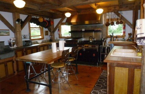 The addition has been hand made from a dated 1800 barn from New Hampshire. These hand-hewed, exposed beams have been reconstructed to make it difficult to see where the old house ends and the new begins.