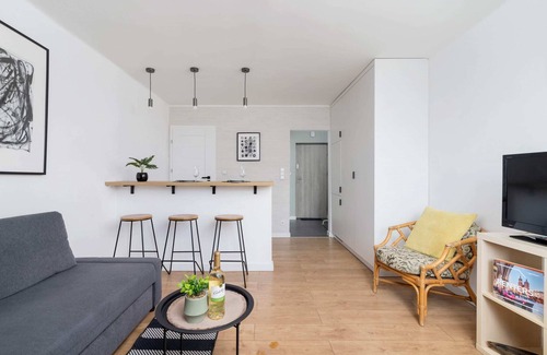 This tastefully decorated studio apartment can accommodate up to 2 people. It consists of a room with a kitchenette and a bathroom with a shower. All elements of the flat work together to create an aesthetically pleasing whole. The studio will also be a great option for business travellers, as a work desk with a chair is prepared. A Tv and free WiFi connection are available in the apartment. Other amenities include a dishwasher, a microwave and an oven to prepare home-cooked meals. A complimentary toiletries, towels and bed linen are provided for guests to start their stay.