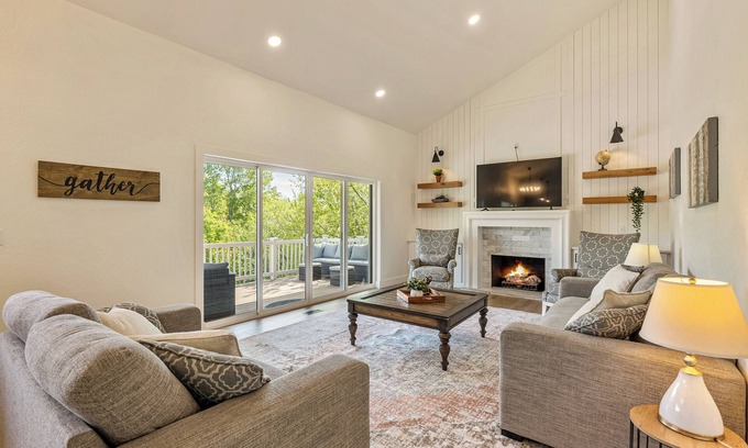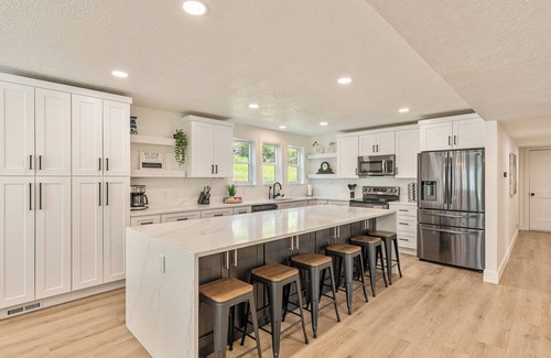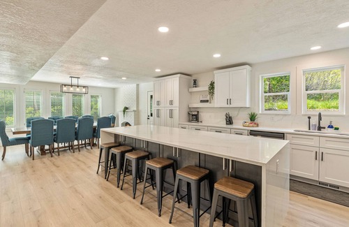 This newly remodeled home is beautifully furnished with high-end, modern bathrooms and a gorgeous, large kitchen and dining space (with a kitchenette and second fridge downstairs).