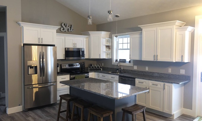 Welcome to our newer home in the Scenic North Subdivision across the street from beautiful Crystal Mountain. See the "mountain" and the lights as you sit in the new 7- person hot tub and around the outdoor firepit after a long day at the resort. This house is brand new and features 4 bedrooms, 3 full baths, including a private master bath with a walk in ceramic tile rain shower, an open floor plan with a spectacular fully appointed kitchen with large island, full finished basement with a pool table. Taking reservations now.