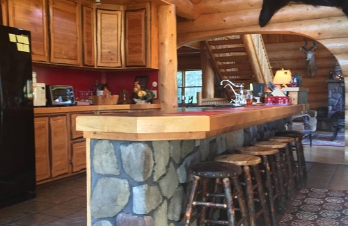 Massive hand-peeled logs shipped from British Columbia create the framework for this beautiful Adirondack Great Camp. Wake up to the peace and quiet of the woods that surround and the sunrises that stream in thru the large expanse of glass. A front deck off the great room and the attached covered porch makes for wonderful gathering areas for cookouts, or to sit and watch the beautiful sunsets drop behind the Adirondack Mountains. The main floor is comprised of a custom kitchen with beautiful yellow spruce cabinets that were custom built from the stand of spruce trees where the cabin was built . The 18' stone island makes for an enjoyable meal preparation and gathering area, a dining room with seating for 12, and bistro table seating for 4 . The great room with a large wood-burning fireplace under a massive cathedral ceiling is a wonderful area to relax .