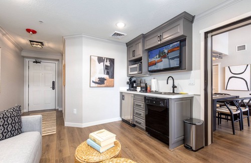 The primary bedroom features a king bed and an amazing steam shower. The second bedroom has a pocket door for privacy (with lock-off capability), has its own bathroom with a steam shower and double sinks as well as a separate kitchen, making this unit perfect for multiple families. Also included are four BRAND NEW plasma TV's, stereo, dining room, family room, fireplace, washer/dryer, and much more. Kitchens are fully furnished with refrigerators, stoves, microwaves, utensils, linens, pots and pans, etc.
