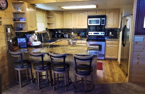Pet friendly well established family-owned Ski in/out cabin. Recently upgraded all showers with top-of-the-line stone and fixtures. 28 cu ft refrigerator with additional refrigerator in garage. Furniture is great quality with leather couches and clean mattresses with mattress covers. Each room is fully furnished with dressers, upgraded new UHD SMART TVs (HD Dish Service throughout house), high speed internet, and plenty of room with the added touch of themed interior decorations. All bathrooms and kitchen have hardwood floors.