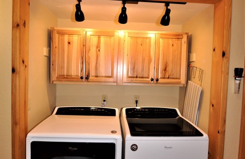 The second level of the cabin has the large master suite which has a private balcony and spacious bathroom. The second bedroom is a full-sized junior master suite with a private bathroom. Each room is professionally decorated with a mountain theme to add to the ambiance. Both rooms have brand UHD SMART LCD TVs for your private enjoyment. Additionally, there is a laundry room with extra capacity washer and dryer. Laundry soap is included.