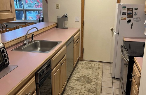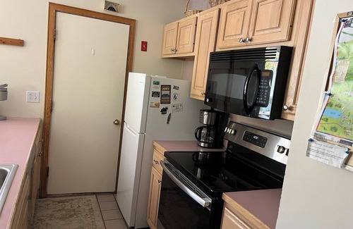 The living room/dining room has a wood-burning fireplace (free wood right outside the condo door) and large flat-screen TV . There are double doors leading to an outside deck and backyard for kids to play in. The TV is internet connected so there is access to live streaming tv
