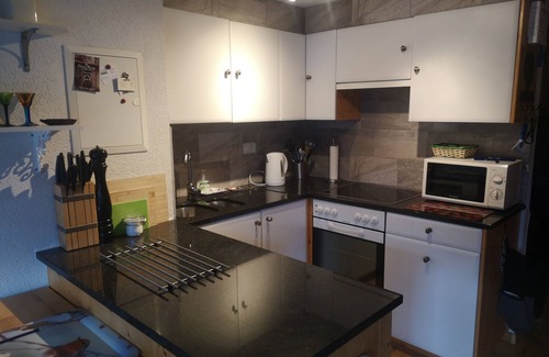 Cosy living room with fantastic unobstructed views looking over the mountains. Smart TV. Good size dining room table to sit eight people. Kitchen has a fridge- freezer (see photos for size) , wine cooler, electric hob and oven, dishwasher and microwave. 2 bathrooms both with a bath and overhead showers. 2 toilets. Access to large balcony with beautiful views . There is a private communal ski room to store ski boots and skis and two private parking bays.