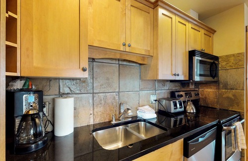 To ski out, exit the deck door onto the groomed ski run, which leads to the Serwas Run, providing access to several chairlifts. To ski back, take Serwas Run after the Silver Tip Landing bridge, and any of the paths on the right will bring you back to this condo. An illuminated pathway leads to the resort village.