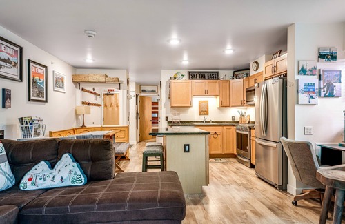 This condo is located on the ground floor of a newly remodeled building, where you'll find a seasonal outdoor swimming pool waiting right out back. You can ski home on winter afternoons to find comfortable features at every turn, from a private washer/dryer for your snowy socks to a gas-powered fireplace with a flatscreen TV mounted up above. The full kitchen offers polished stainless steel appliances (including a French-door refrigerator and a dishwasher), a prep island with bar seats for two, and a charming breakfast nook.