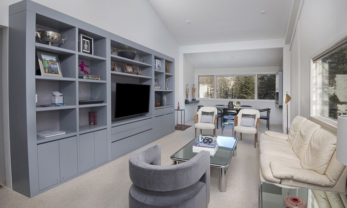 Welcome to the supremely well situated Lionshead Center. This retro-mod condominium is decorated with a mix of eclectic 70’s stylish ‘shaggy’ chic furnishings, accented with selective Tibetan inspired sideboards and statuary. It has appropriately sized picture windows that boast stellar views of Pines and Aspens, gathered in full display. LC #304 is a uniquely charming creekside unit within walking distance of the ‘Born Free’ ski lift and Lionshead Village. Premium assigned covered parking is an added bonus.