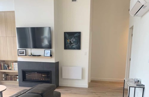 A Ski-In/ Ski-Out condo on a family friendly mountain in the Eastern Townships of Quebec with views of Lake Memphremagog and the Owl’s Head mountain. Long-term rental (32 days+) with flexible dates. Brand new penthouse unit in Glaz 5 development. Two bedrooms with King beds and a mezzanine with an office space and a comfortable Queen queen-sized retractable box bed (NOT a hide a bed with mattress). Two full baths with heated floors. Very bright and lighted with 3 exterior walls. Fully equipped kitchen and brand new appliances and furniture. Propane fireplace and high-resolution flat-screen TV. Open space design with dining, kitchen and living all with high cathedral ceilings.