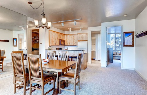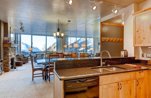 This spacious 2 bedroom, 3 bathroom Snowbird condo is a wonderful option for small groups or vacationing families. There is plenty of room to come home to and call your own, flexible sleeping spaces, and easy ski in/ski out access for an unmatched vacation to Snowbird Resort and the Alta ski area. The open concept living area is beautifully appointed with modern interiors, a cozy stone clad fireplace, a 40” flat screen TV, dedicated dining area with seating for 6, and a fully equipped kitchen for convenient dining in on vacation. The views of Utah's Wasatch mountains are incredible from every angle!