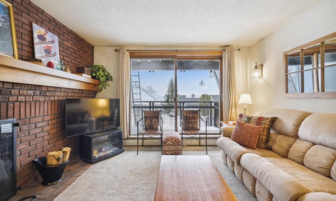 The spacious living room boasts a wood-burning fireplace and a 40 flatscreen TV, creating a cozy atmosphere for apr s-ski relaxation. Sliding doors lead to your private deck with stunning mountain vistas, perfect for enjoying the fresh air. An extra queen sleeper sofa provides additional sleeping options.