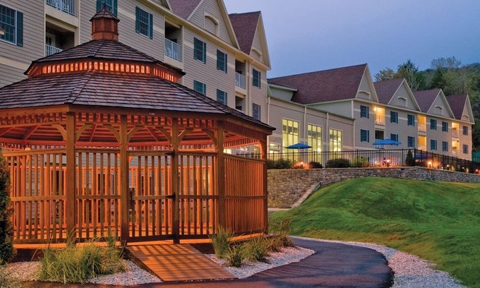 At the base of Jiminy Peak Ski Mountain, this ski resort is an exceptional choice for mountainside play. The area delivers a wealth of adventures, making this the perfect home base for exploring nearby Berkshire County towns and attractions. This resort is in the country, with food options for groceries at nearby farms. Target is a drive away. A country store is at the resort. Several restaurants are a drive away. Enjoy the heated indoor/outdoor pool and hot tubs with a mountain view. The resort has an activities calendar that suites a variety of interests. Ski storage, a sauna, a game room and fitness center are on site.