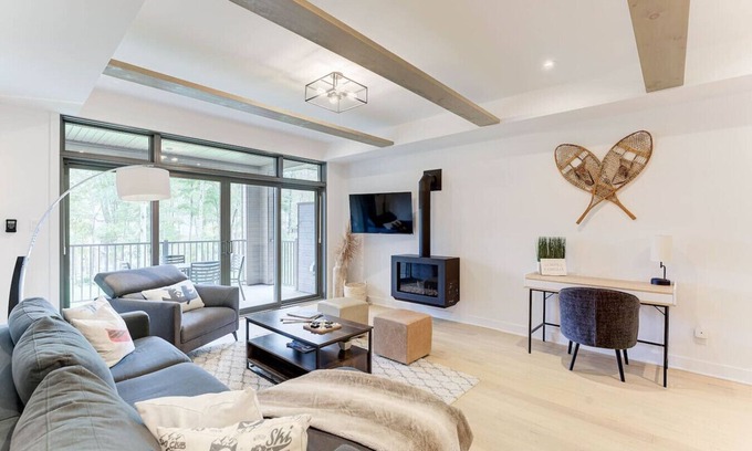 Our condo is an open concept modern design. A brand new construction near the ski slopes of The Mont-Tremblant Mountain. This unit offer a nice view of the moutain and nature. Located at less than 1km from the ski sloppes, it offer high ceiling windows, 2 bedroom , 2 full bathroom , a large open space for kitchen, dining room and living room. This is the perfect place to enjoy times in family or with friends with a glass of wine right new to our fire places.