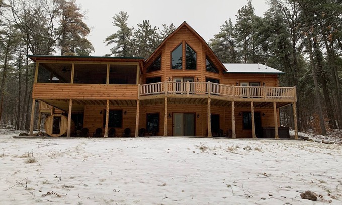 Our luxurious log cabin features an open floor plan with large great room windows, a double sided gas fireplace, and a master bedroom on each floor. Throughout the house you will see beautiful custom handmade woodwork from the Adirondack Park. We have numerous sleeping options from king size beds, queen size beds, bunk beds with twin XL mattresses and comfortable pull out sofa queen bed. You get to enjoy the rustic and remote beauty of the area while also having numerous first-class amenities: a 7 person hot tub, 4 person sauna, pool table, bar, large 4K smart TV’s, grill, and much more!