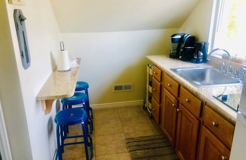 Perfect crash pad studio with a bathroom, shower, smart TV, and a kitchenette.