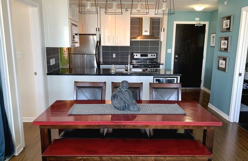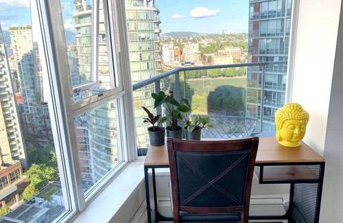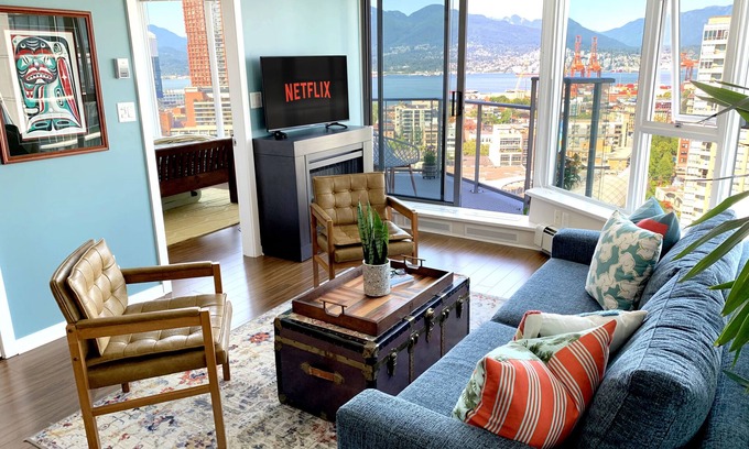 Welcome to our downtown Vancouver, gorgeous glass box up in the sky. We have a 2 BD/2BA + Den with floor to ceiling windows so there is plenty of natural light and there is a partially covered private deck with table & chairs if you want to sit outside and breathe in the serenity of the scenery. With panoramic views of the mountains, water, and city from every room you will experience exactly why we love our city so much. A superb location with great amenities, check us out! Our home is a 2 bedroom + den/3rd bedroom, 2 bath condo with just over 950 sq ft of eclectic designer space! As a long-time Superhost on other sites we've received 600+ fabulous reviews of us, our listings (past and present), and the location.