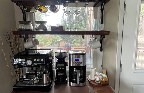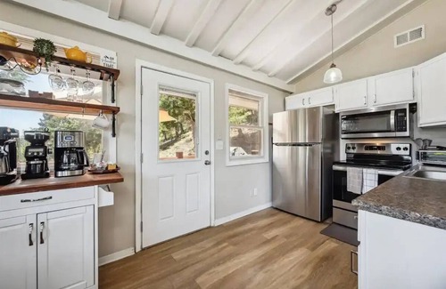 The spacious open-concept living area features a welcoming fireplace, ideal for cozy evenings with family and friends. Large windows provide stunning views of the surrounding mountains and fill the space with natural light. There are 2 bedrooms with new mattresses and high end bedding. and 1 full bath stocked with luxury towels and amenities on the upper floor. A full kitchen featuring newer GE appliances, microwave, utensils, glassware, etc.. Also, a coffee bar with a separate espresso machine to start your day is available.